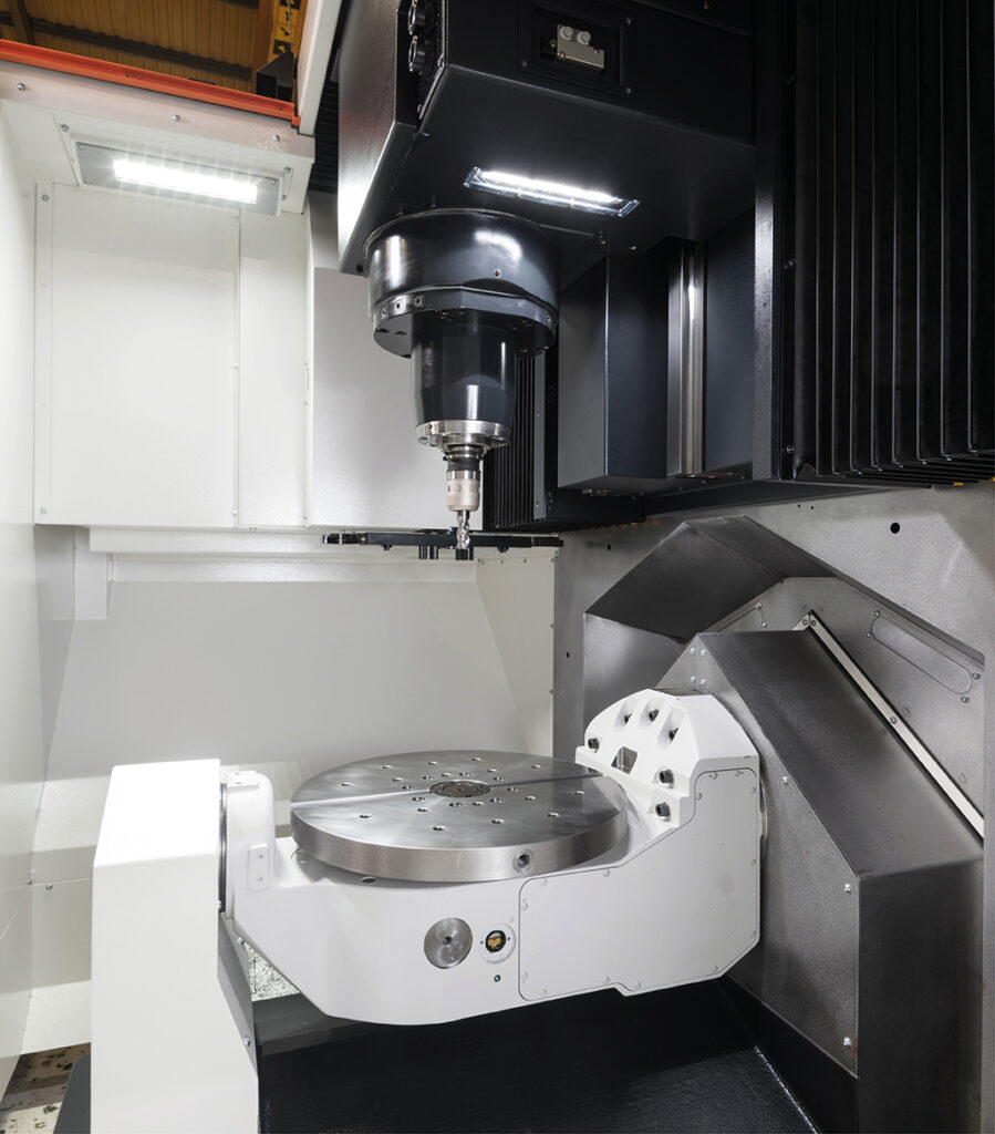 - Centre d’usinage vertical à 5 axes avec construction en pont, doté d’une table à tourillons entièrement supportée, offrant une grande rigidité pour un usinage de haute précision.